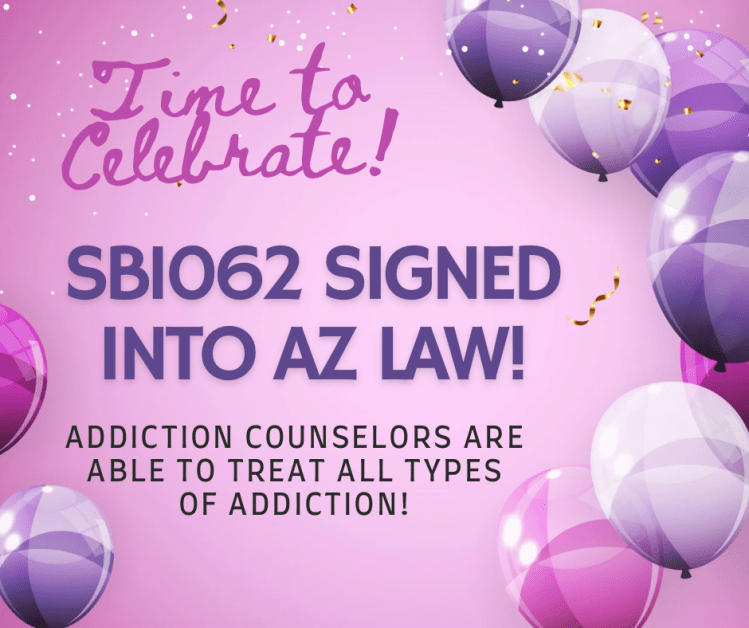 SB1062 was signed into law by Governor Hobbs on 4/23/24! When the law goes into effect on 9/14/24 (the general effective date, 90 days after the 2023-2024 AZ legislative session ended), “Substance abuse” counselors will become “addiction” counselors and able to work with clients with non substance-related addictions! (All ethical standards apply, including the mandate to only work within the professional’s competency – including education, training, and supervision or peer consultation.) AAAP is dedicated to providing more opportunities for training and supervision in behavioral/process addictions and supporting the workforce through this necessary and proper change.